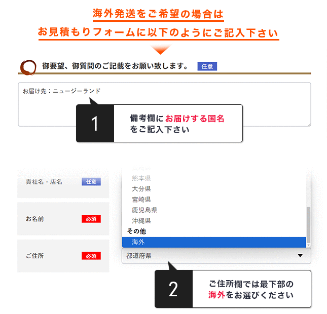 WEBフォームをご使用の場合はお客様情報のご住所欄にて、最下部の「海外」を選び、備考欄にお届け先の国名をご記入下さい。